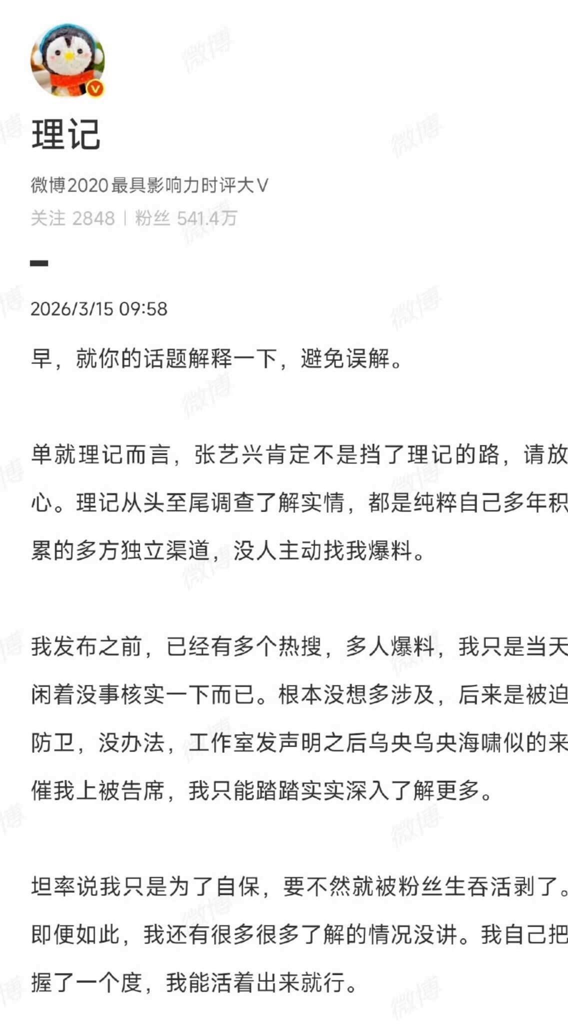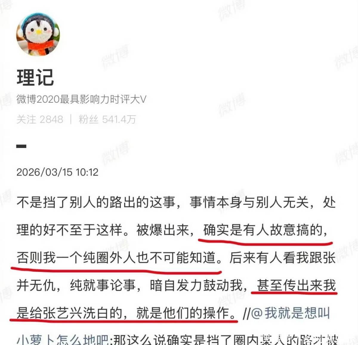 谁能料到,反转来得比翻书还快!近日理记突然又发文吐槽,直接推翻了自己之前的爆料,说张艺兴被罚这事儿,根本不是单纯的艺人违规,而是被某圈内人故意拿来挡枪的!理记在文中明确表示,虽然他之前说的张艺兴被罚细节是真的,改变不了张艺兴受处罚的事实,但那位圈内人,明明知道张艺兴出事,却刻意把他的倒霉事抛出来,目的就是为了压下自己当时的负面热搜,掩盖自己的舆情,简直太损了!他还透露,这位圈内人和张艺兴私下很熟,两人不是同龄人,对方比张艺兴大不少,而且还是同档次的竞争对手,按说抬头不见低头见,居然能做出这种落井下石的事,实在让人不齿。紧接着,理记又发了一条文补充,说张艺兴其实并没有挡谁的出路,纯粹是自己处理事情不够妥当,才给了别人可乘之机,被人拉出来挡枪,言语间还带着一丝惋惜。